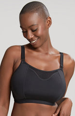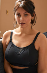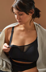 Katherine is a black non wired crop-top style nursing bra. Offering a stylish loungewear look with the practicality of drop down cups for feeding, Katherine has a side sling that feels soft against your skin, offering a soft support and more skin to skin contact for mum and baby when feeding. Katherine comes with 6 fastening positions for greater adjustability and comfort throughout the different stages of pregnancy, making this nursing bra perfect to see you through both pregnancy and nursing. We've added soft fabrics and elastics throughout this style to ensure this supportive nursing bra offers incredible comfort when you need it most.